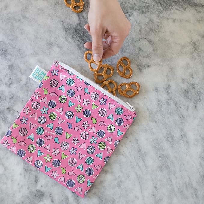 Bumkins Reusable Sandwich and Snack Bags, for Kids School Lunch and for Adults Portion, Washable Fabric, Waterproof Cloth Zip Bag, Travel Pouch, Food-Safe Storage, Large, Love Birds Pink