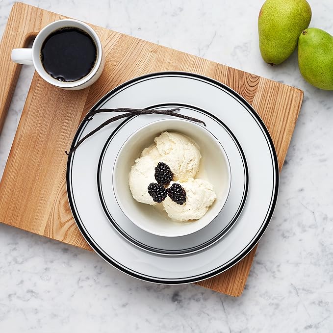 Amazon Basics 16-Piece Cafe Stripe Kitchen Dinnerware Set, Plates, Bowls, Mugs, Service for 4, Black