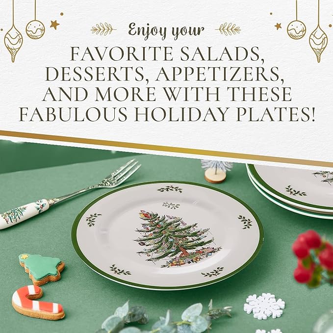 Spode Christmas Tree Melamine Salad Plate (Set of 4) - 8 Inch Shatterproof Serving Plate for Holiday Meals, Holiday Party - Festive Tableware for Indoor & Outdoor Use, Dishwasher Safe Dinnerware