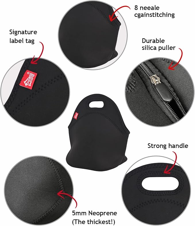 - [BUILT TO LAST AND EASY TO CLEAN] The flat bottom keeps it upright, perfect for bottles or dishes that you don't want tipping over. This stretchy neoprene lunch tote bag is made of machine washable material, stain-resistant neoprene is very easily washable, just rinse clean or machine wash and air dry.