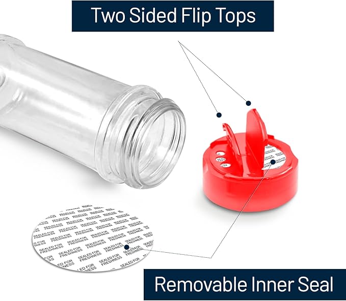 - Easy to Use: The lids of our spice jars are two sided flip tops for shaking or pouring spices. There is a removable internal seal under the lid of the jar to keep the product fresh and delicious.