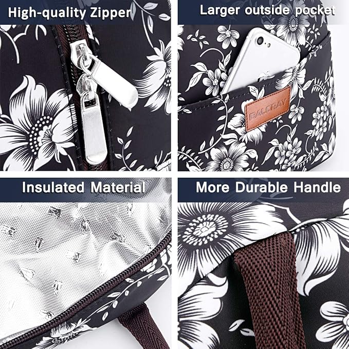 BALORAY Lunch Bag for Women Men Insulated Lunch Box for Adult Reusable Lunch Tote Bag for Work, Picnic or Travel (White Flower)