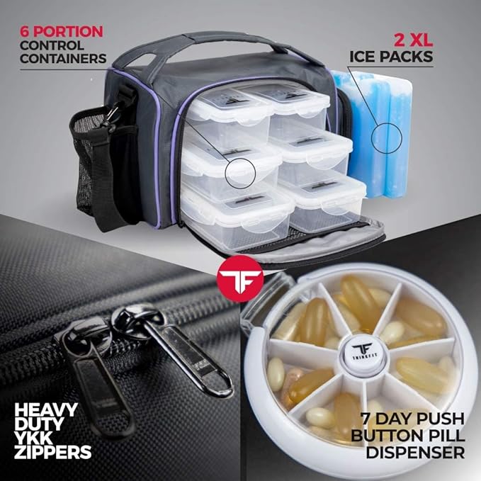 - BEST MEAL PREP LUNCH BAG: ThinkFit lunch boxes include 6 meal prep containers, a pill dispenser, shaker cup & 2 LARGE reusable ice packs. Popular with men and women who have active lifestyles, daily gym routines, hectic work schedules or body build.