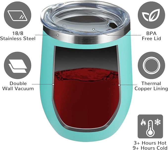 - [Advanced Insulation Technology:]Double wall vacuum insulated prefection in a stemless wine tumbler made from lifelong Stainless Steel! Set off on your refreshing picnic, hiking or camping adventures with your water, wine, or cocktail icy-cold for 9 hours or your coffee and tea scalding-hot for over 3 hours!
