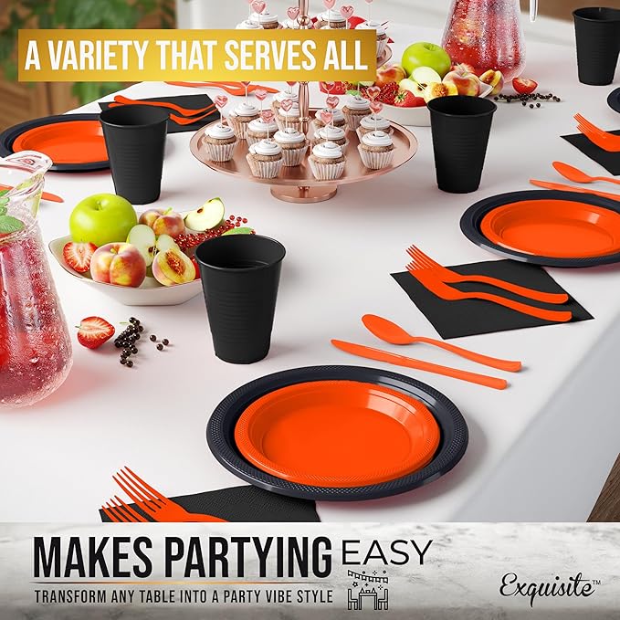 - All Occasions: From family dinners to special events, our Orange and Black plates will add style to your table. These Orange and Black Plastic Plates for Party sets, complete with napkins, utensils, & plastic cups, are great for parties or daily use. The plates and napkins party supplies are a must-have for a seamless dining experience. Enjoy our disposable Orange and Black plates set at your next event!