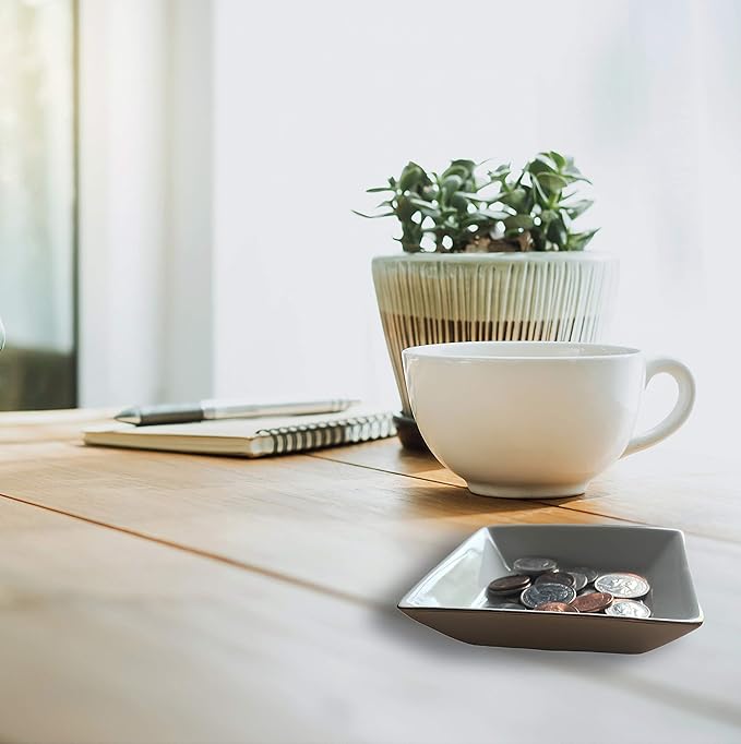 - Adorable Jewelry Tray Is 4" x 4" square and is adorned with a golden glaze trim. It is the perfect size for a vanity, bedside table, or near a basin to hold rings and other trinkets. An elegant ring holder and a special gift idea.