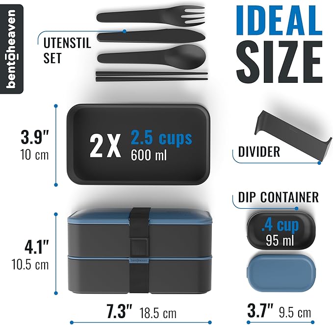 - Your meals deserve a Premium Bento Box! It features 2 stackable compartments that hold 40 oz., 2 silicone sealed lids, divider, dip container, chopsticks, fork, spoon, knife, and a sealing strap.