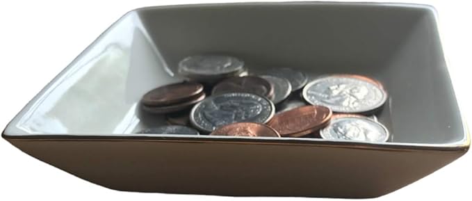 - Adorable Jewelry Tray IS 4" x 4" square and is adorned with a golden glaze trim. It is the perfect size for a vanity, bedside table, or near a basin to hold rings and other trinkets. An elegant ring holder and a special gift idea for her.