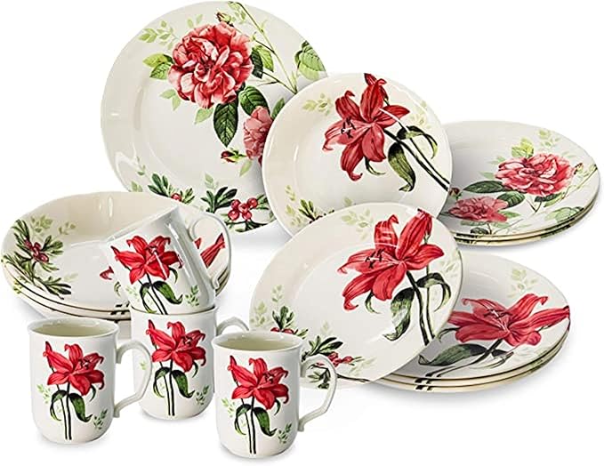 Tudor Royal 16-Piece Round Porcelain Dinnerware Set, Service for 4, Rosemary, Summer Flowers, Plates Bowls Dishes, Glossy, Premium Quality Dish Set, Unique Pattern
