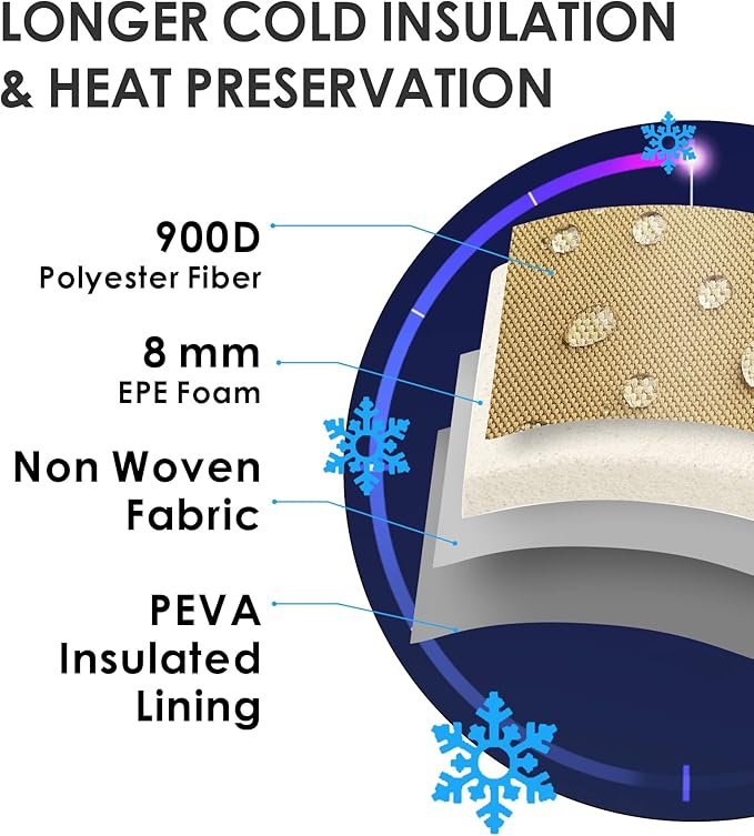 - Enduring Material for Longer Use: Made of 900D polyester exterior is better than 600D fabric in the market. The 8mm EPE foam, PEVA insulating lining, and a non-woven fabric act as protective layers. You can keep the insulated lunch box for a long time and save replacement costs