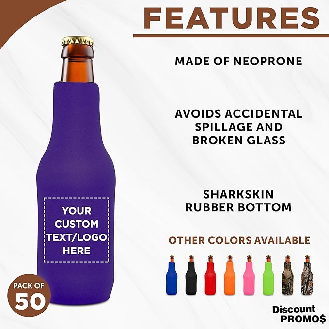 50 Neoprene Zippered Beer Bottle Coolies Pack - Customizable Text, Logo - Sharkskin Rubber Bottom - Purple