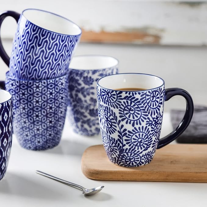 Selamica 16 oz Porcelain Coffee Mugs Set, Ceramic Tea Cup with Handle, dishwasher, oven, microwave safe, Pack of 6, Vintage Blue