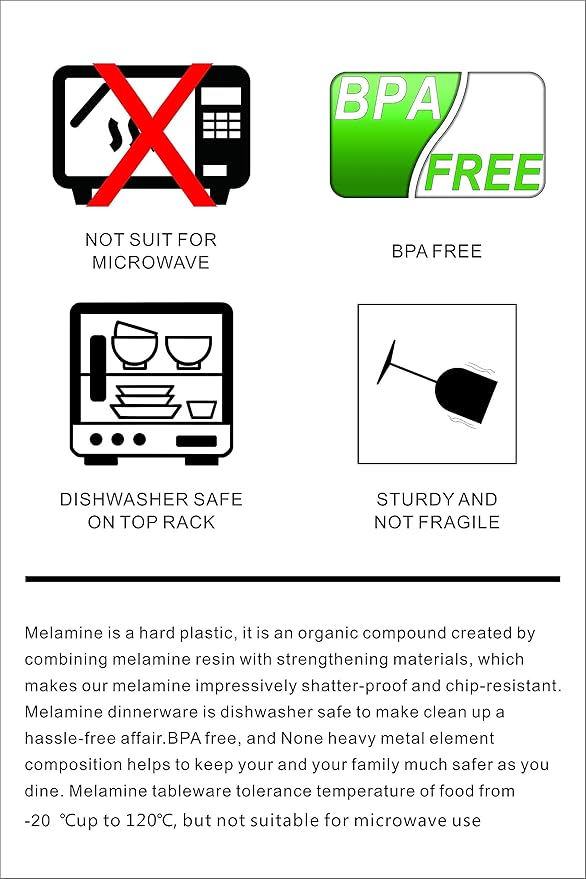 - Melamine Hard Plastic:Made of heavyweight, durable melamine, a HARD PLASTIC material that feels like ceramic but is lighter and less prone to chipping and breaking than ceramic. Suitable for casual use indoors and outdoors.