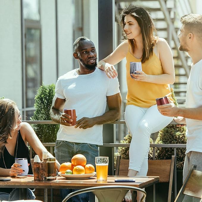 - [Advanced Insulation Technology:]Double wall vacuum insulated prefection in a stemless wine tumbler made from lifelong Stainless Steel! Set off on your refreshing picnic, hiking or camping adventures with your water, wine, or cocktail icy-cold for 9 hours or your coffee and tea scalding-hot for over 3 hours!