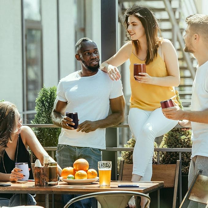 - [Advanced Insulation Technology:]Double wall vacuum insulated prefection in a stemless wine tumbler made from lifelong Stainless Steel! Set off on your refreshing picnic, hiking or camping adventures with your water, wine, or cocktail icy-cold for 9 hours or your coffee and tea scalding-hot for over 3 hours!