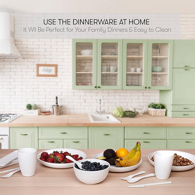 - Multipurpose Dinnerware - Our reusable dishes set for 8 are made for every occasion and will not only be great for home and kitchen use, but also convenient for an rv or camper, a picnic, BBQing, camping, work, school and much more. The unique design allows for easy compact storage as well. You can't go wrong with our wheatstraw dinnerware set.