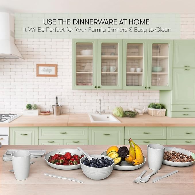 - Multipurpose Dinnerware - Our reusable dishes set for 8 are made for every occasion and will not only be great for home and kitchen use, but also convenient for an rv or camper, a picnic, BBQing, camping, work, school and much more. The unique design allows for easy compact storage as well. You can't go wrong with our wheatstraw dinnerware set.