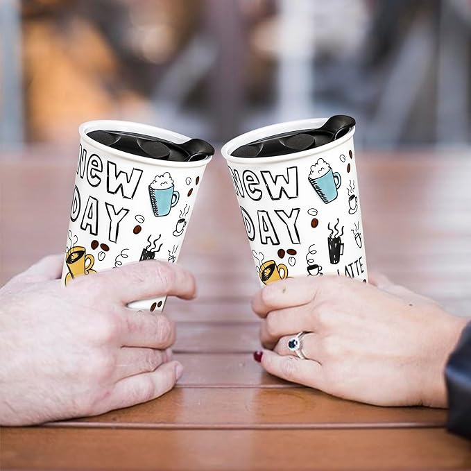 Ceramic Travel Coffee Mug, 12 oz, Portable, Travel Mug with Lid, Double Wall Tall Cup, To Go Tumbler for Car Cup Holder, Splash Resistant Lid, Dishwasher Safe, Gifts for Women Men Her Him (New Day)