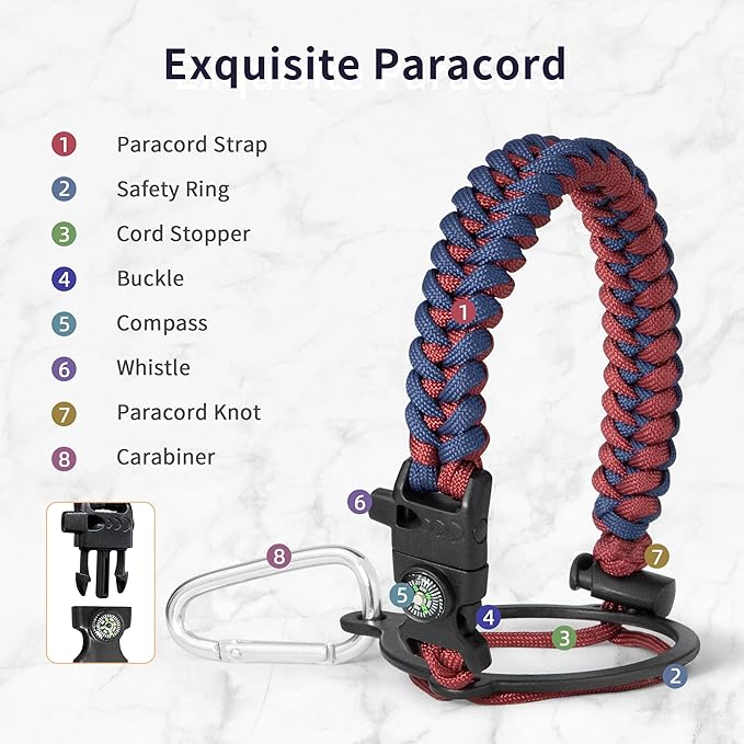 - Full-function Paracord Handle: Brilliant paracord of matching colors bring out the bottle with a touch of youthful vibe. Compact compass and handy carabiner make the bottle the ideal survival kit for expeditions in the wild
