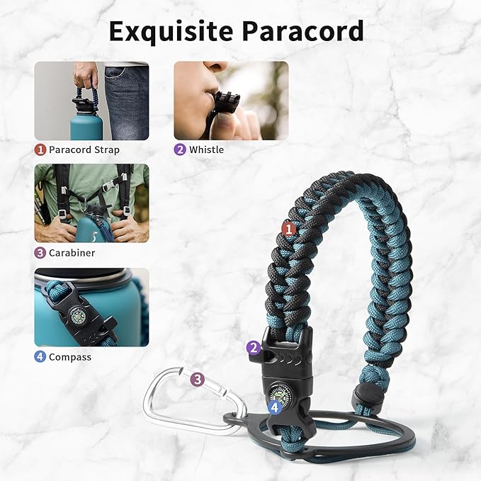 - Full-function Paracord Handle: Brilliant paracord of matching colors bring out the bottle with a touch of youthful vibe. Compact compass and handy carabiner make the bottle the ideal survival kit for expeditions in the wild