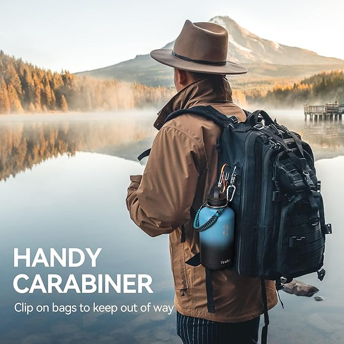 - A Full Pack:64 oz insulated water bottle Included with 3 lids, 1 survival paracord, 2 straws, 1 straw brush, and carrying pouch,1 shoulder strap. this Trebo insulated bottle is fully accessorized to handle any tricky situations,easy to carry clean. Our friendly customer care are always happy to help