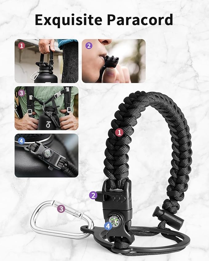 - Full-function Paracord Handle: Brilliant paracord of matching colors bring out the bottle with a touch of youthful vibe. Compact compass and handy carabiner make the bottle the ideal survival kit for expeditions in the wild
