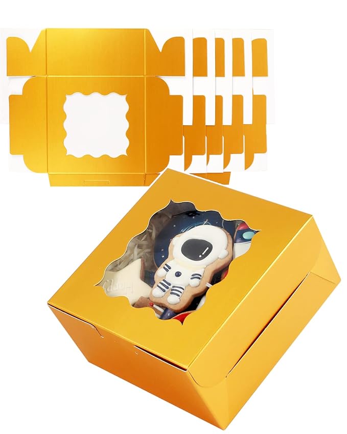 qiqee Gold Bakery Box with Window 36Packs 6x6x3 Golden Cookie Boxes Gold Cardboard Boxes for Cookie, Pastry, Cupcake, Pie, Donut
