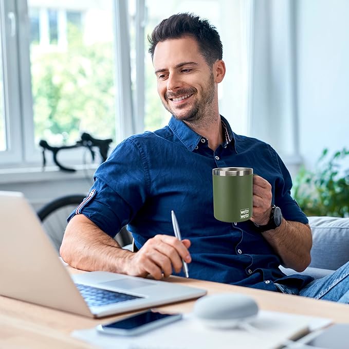 WETOWETO Coffee Mug with Handle, 14oz Insulated Stainless Steel Reusable Coffee Cup, Double Wall Coffee Travel Mug, Powder Coated Olive Green