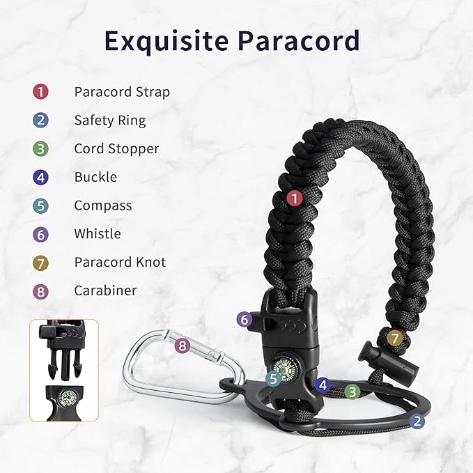 - Full-function Paracord Handle: Brilliant paracord of matching colors bring out the bottle with a touch of youthful vibe. Compact compass and handy carabiner make the bottle the ideal survival kit for expeditions in the wild.