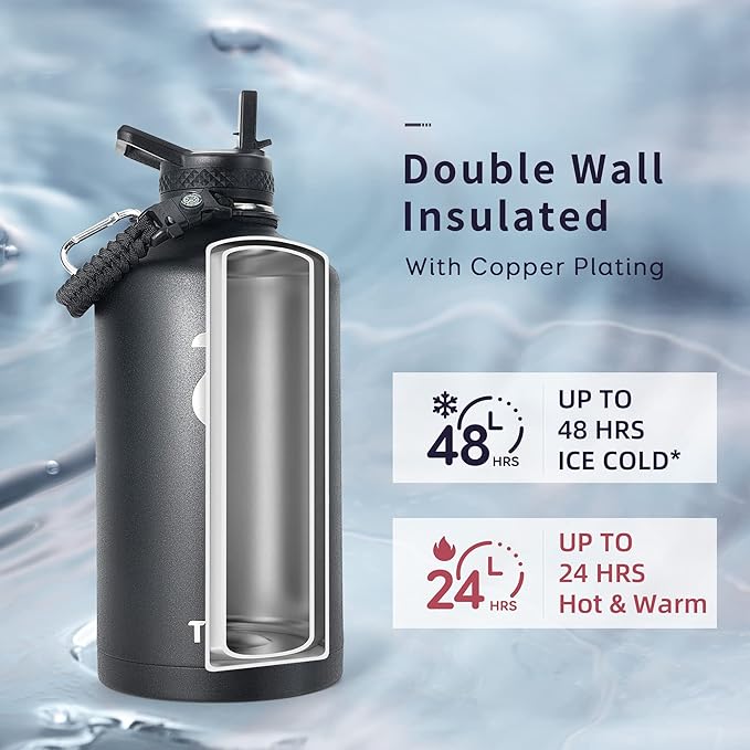 Trebo One Gallon Water Bottle Insulated with Paracord Handle,128oz Large Vacuum Double Wall Stainless Steel Insulated Jug with Straw Spout Handle Lids, Leakproof Keep Cold & Hot,Black