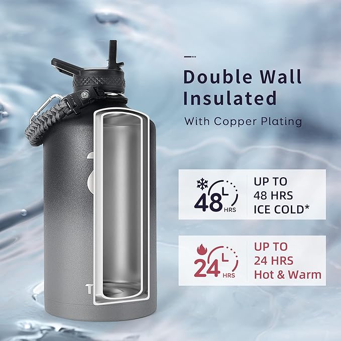 - Double Wall Insulation: Vacuum double wall stainless steel with copper plating maxes its keep-cold to 48 hrs and keep-hot to 24 hrs, allowing you to enjoy your favorite flavor in the long run.128oz large capacity water bottle perfect for outdoor camping, hiking.