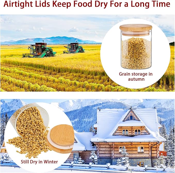 - 【STORAGE AIRTIGHT GLASS JARS】: The sealing cover is equipped with a food-grade silicone sealing ring that perfectly fits the bamboo lid's groove, which effectively prevents the flow of gas and the entry of ants, allowing food to be stored for a longer time in the glass jars with an airtight bamboo lid, especially perfect for keeping food dry and fresh.