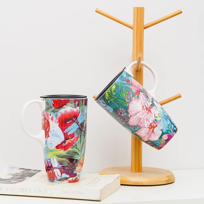 Topadorn Ceramic Coffee Mug Travel Mug with Lid Tea Cup,Set of 2,17oz.Dragonfly