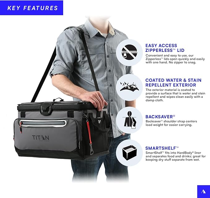 - TITAN DEEP FREEZE ZIPPERLESS HARDBODY COOLER: Zipperless cooler features a patented, "flip-open" Zipperless lid for quick access to food and drinks; Keeps ice up to two days and holds up to 48 cans