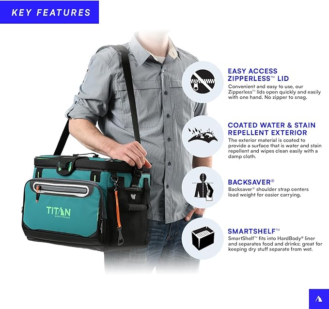 - TITAN DEEP FREEZE ZIPPERLESS HARDBODY COOLER: Zipperless cooler features a patented, "flip-open" Zipperless lid for quick access to food and drinks; Keeps ice up to two days and holds up to 30 cans