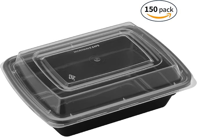 - SPECIFICATIONS: These 12 oz containers use food grade bpa free plastic for the body and lids. Our material is oil and water resistant with no leeching or unsightly stains. These rectangular containers come in a 150 pack to give you a better deal for bulk meal prepping and to-go service.