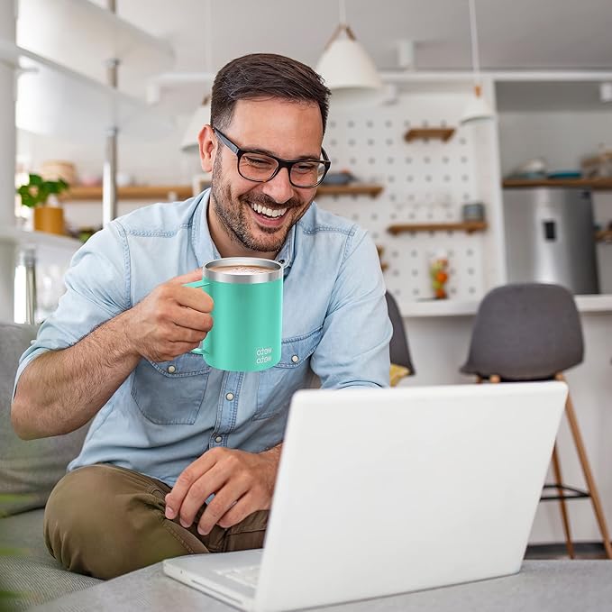 - The 14oz coffee mug with a handle fits most hands, making it easy to hold. It comes with two BPA-free lids – a sliding lid and a flip straw lid – allowing you to switch as needed
