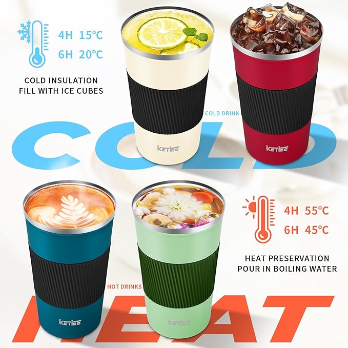 - 【 Cupholder Frindly and Portable 】 5.5 inches height, 3.3 inches base width and an anti-slip rubber cushion make KETIEE reusable coffee cup with lid not only fit most cupholders, but also easy to grab and go. The sip hole on the top of the lid can let you enjoy your coffee conveniently with one hand.