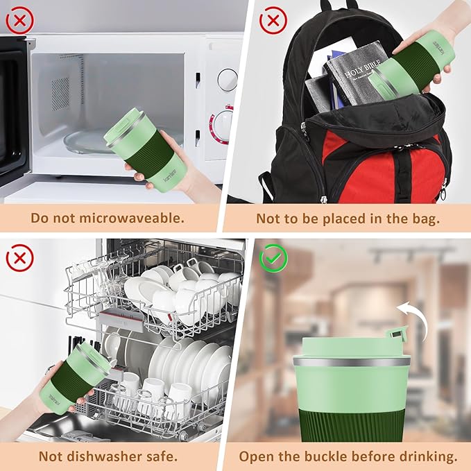 - 【 Leakproof Design 】 Built to house 12 oz of your favorite cold or hot beverages, this is one coffee cup with seal lid preventing from leak or spilling (The coffee mug buckle can be closed tightly after two "clicks"). Small body design makes this coffee travel mug fit most coffee makers.