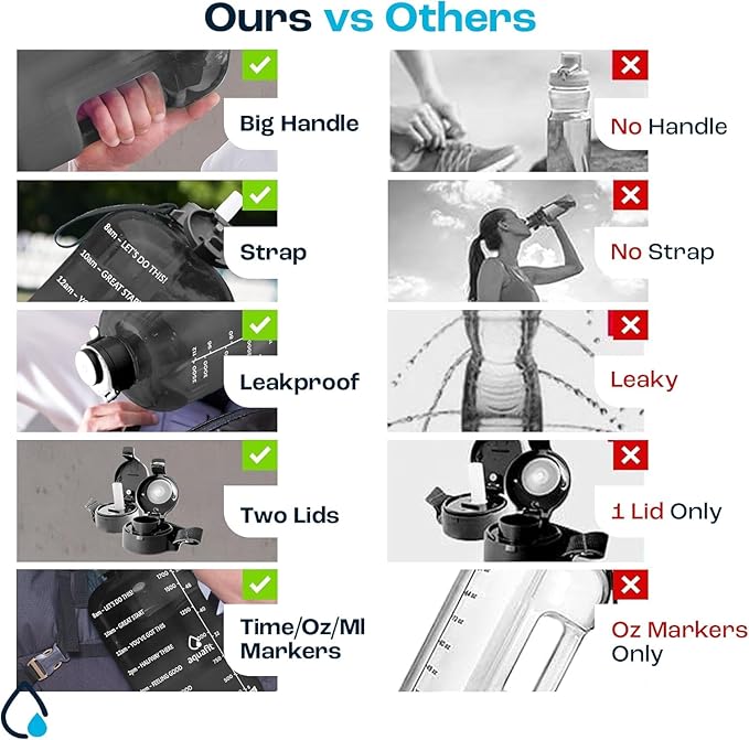 - Track how much you drink - Our BPA Free one gallon water bottle comes with time markers on the side so you can see your daily water intake and stay on track meet your health and fitness goals.