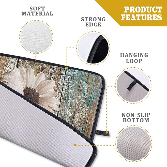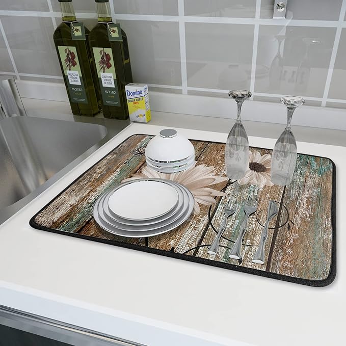 Rustic Daisy Board Dish Drying Mat for Kitchen Countertop 18x24 inch Fall Sunflower on Wooden Plank Dish Drainer Mats Fast Drying Country Shabby Chic Flower Dish Pad Vintage Kitchen Drying Decor Large