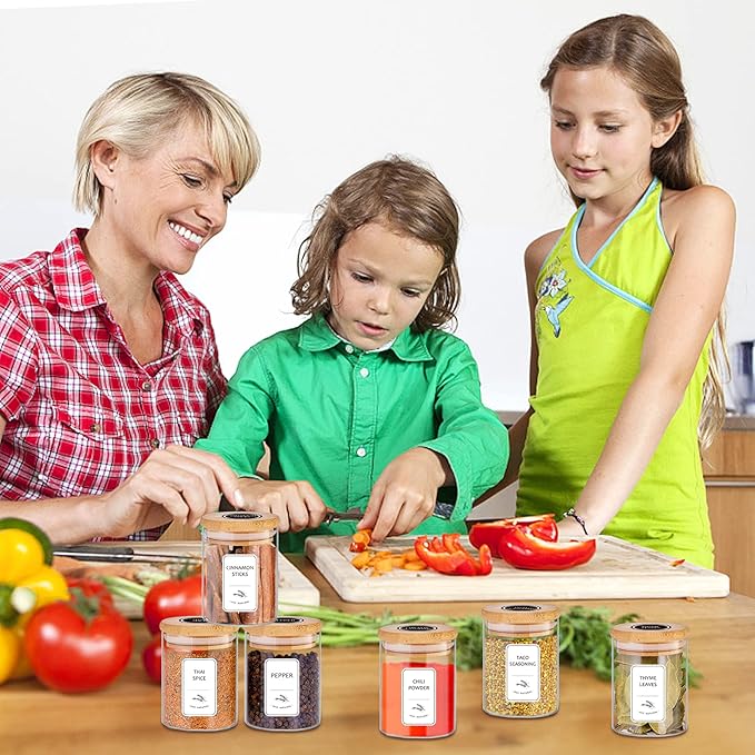- MULTI-FUNCTIONAL SPICE JARS: The glass spice jars with bamboo lids are not only used for storing spices, these 7.5 oz spice jars have endless uses. You can also use the empty spice jars to store other things. They can also be herb jars, snacks jars, nuts jars, candy jars, tea jars, seeds jars, buttons jars, etc. You can put the spice jars with label in your kitchen, cupboards, pantry, desk or handbag to help you keep all kinds of small items. These 7.5 oz spice jars will simplify your life.