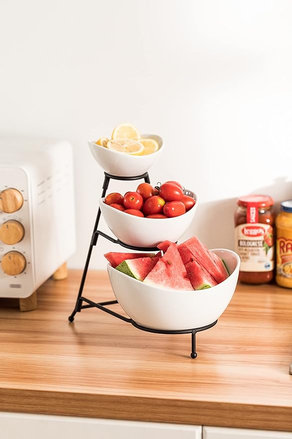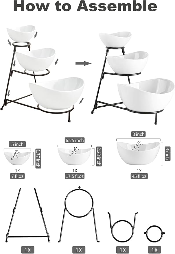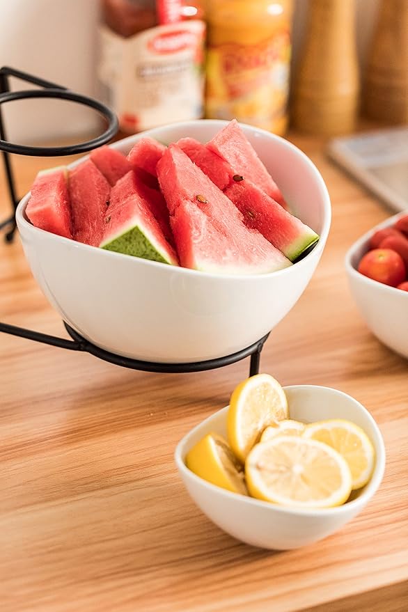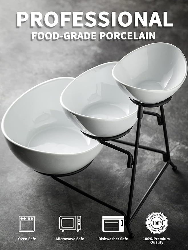 - Elegant Design: The trangle rack is strong enough to hold the porcelain oval bowls, provides more balance & stability. The bowls are different sizes, the curved edge which makes it extra stylish, looks great and does not take up a lot of space