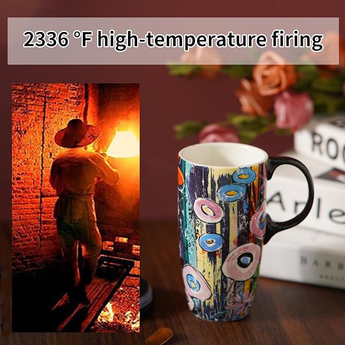 Topadorn Ceramic Travel Mugs Porcelain Latte Tea Cup Coffee Mug with Lid and Handle,17oz. Abstract Garden