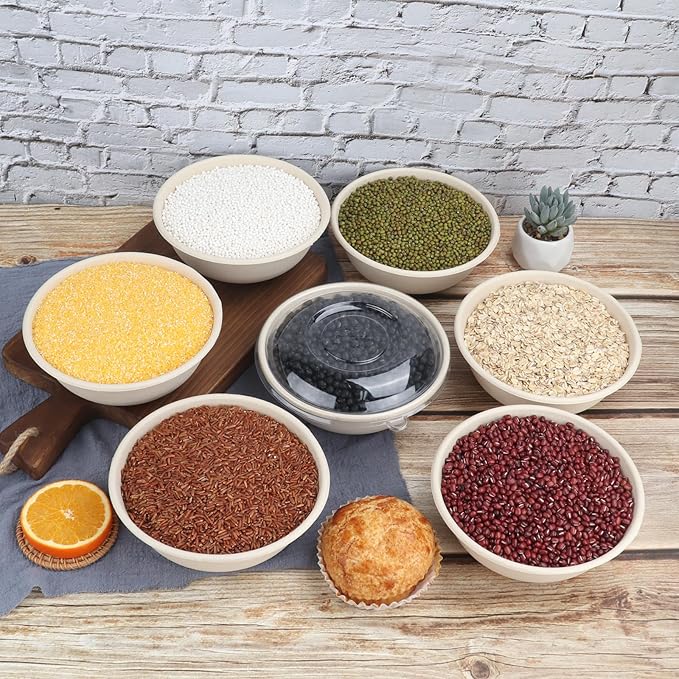 - Packing: 28 oz Sugarcane Fiber round bowls, pack of 50 bowls and 50 lids
