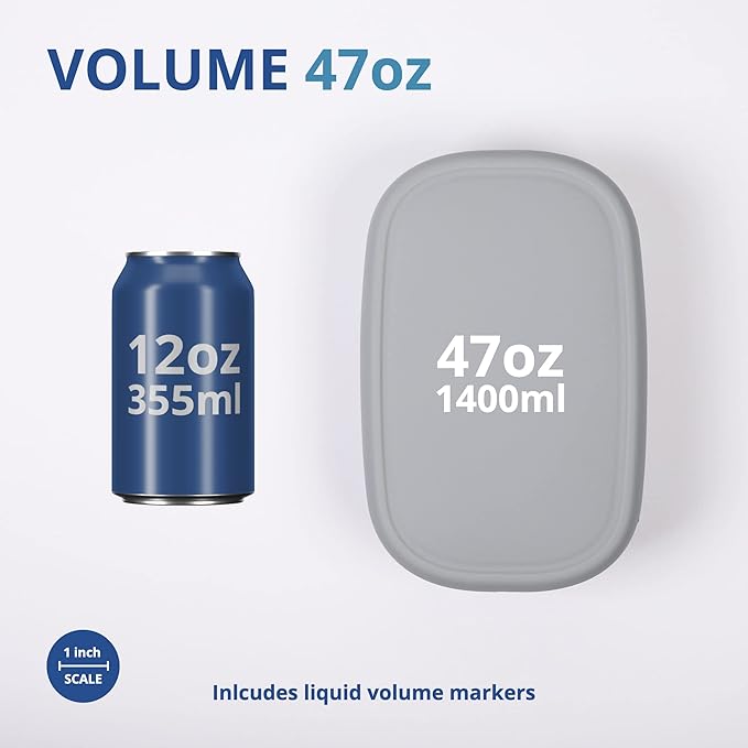 - Versatile and Durable - Our large silicone food container is ideal for storing lunch, leftovers, and snacks. It has liquid volume markers, and is temperature resistant (-40°F - 482°F), microwave friendly, unbreakable, easy to clean, and reusable.