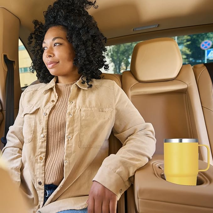 - Colored Powder Coated Tumbler: The stainless steel coffee mug is crafted with stylish color powder coating, gives you multiple color options. It's cool to touch when filling with hot water and also sweat proof with cold water, always keep your hands comfortable while holding the coffee travel mug with handle