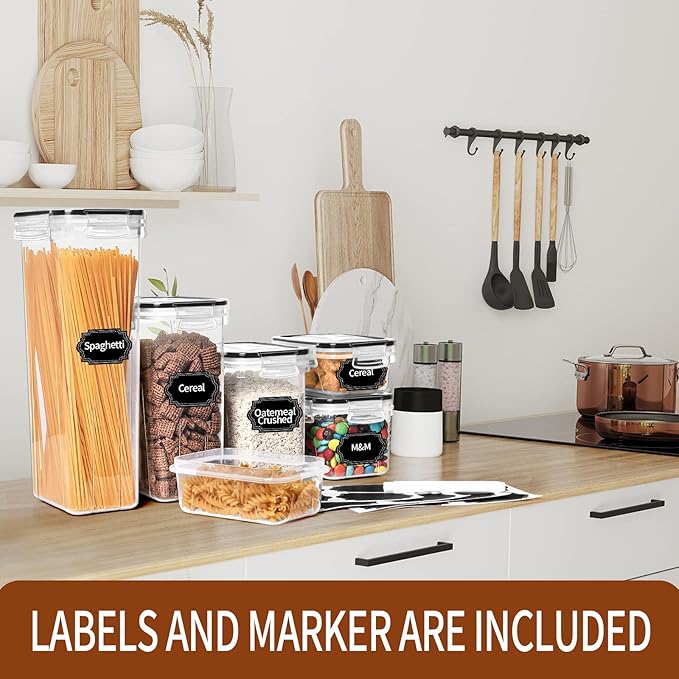 PRAKI Airtight Food Storage Containers with Lids, 12PCS Plastic Kitchen Storage Containers for Pantry Organizers and Storage - Cereal, Rice, Flour and Sugar Containers with Labels & Marker