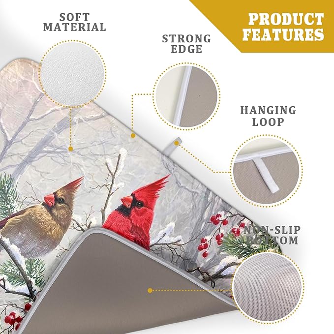 Red Bird Dish Drying Mat Merry Christmas Dishes Pad Absorbent Fast Dry Dish Drainer Mat Protector for Kitchen Counter 18 x 24 Inches