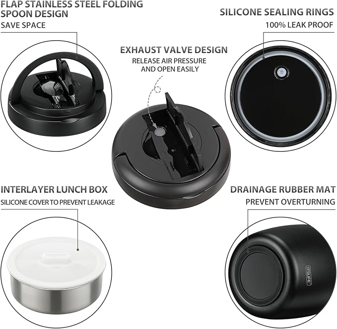 - The screw cap design with seal washer guarantees 100% leak-proof, the hidden handle and hidden folding spoon are designed for easy opening and carrying, and the bottom silicone pad prevents the food jar from moving or tumbling.